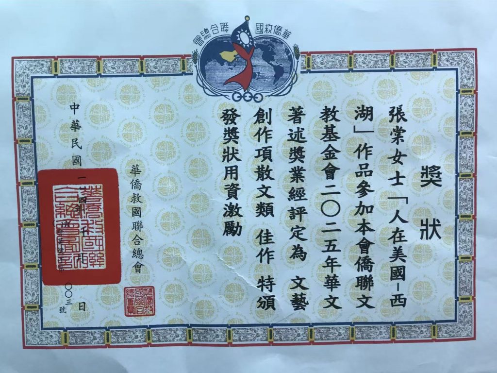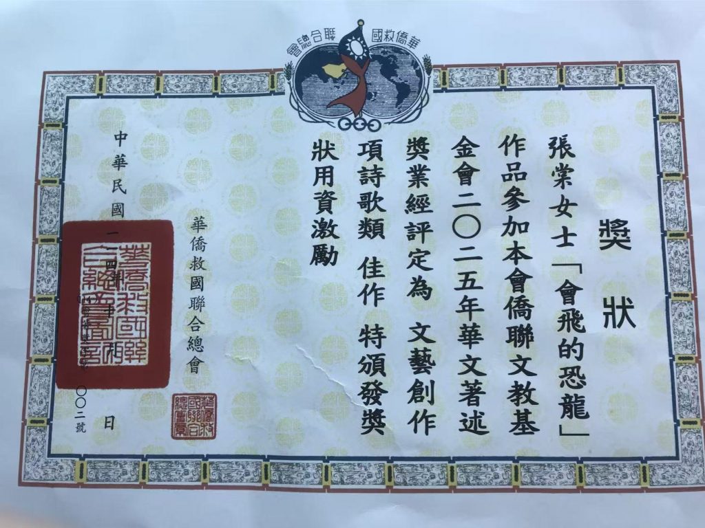 平時十月初比赛揭曉,聽說今年申請人特别多,所以今年一直到十一月初才宣布结果,我的两本書都獲得佳作奬。我的散文是第二次獲佳作奬,難得的是我的詩歌是第一次得獎。散文、詩歌雙雙得奬,非常難得,尤其自已出自詩人世家,算是没有辜負祖先的遺傳基因。